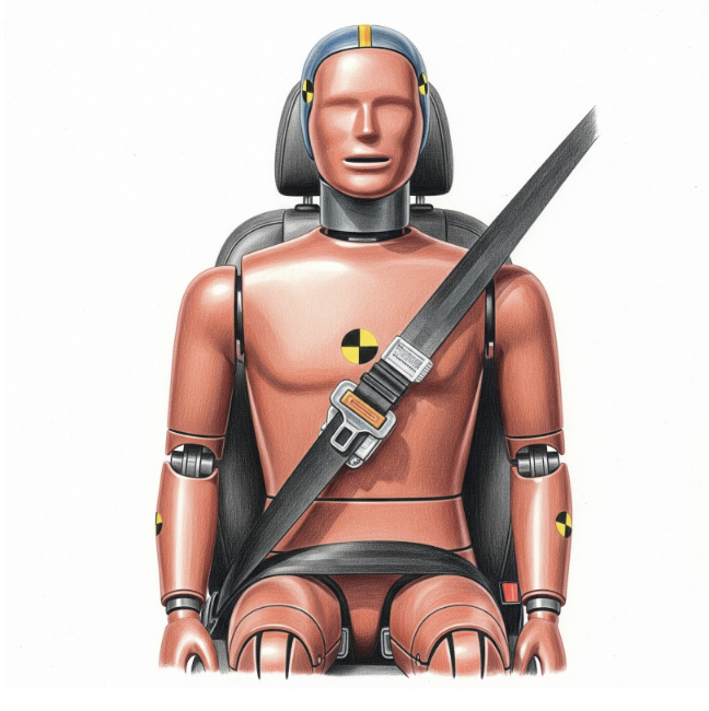 image generated by gemini: “a crash test dummy wearing a seat belt”